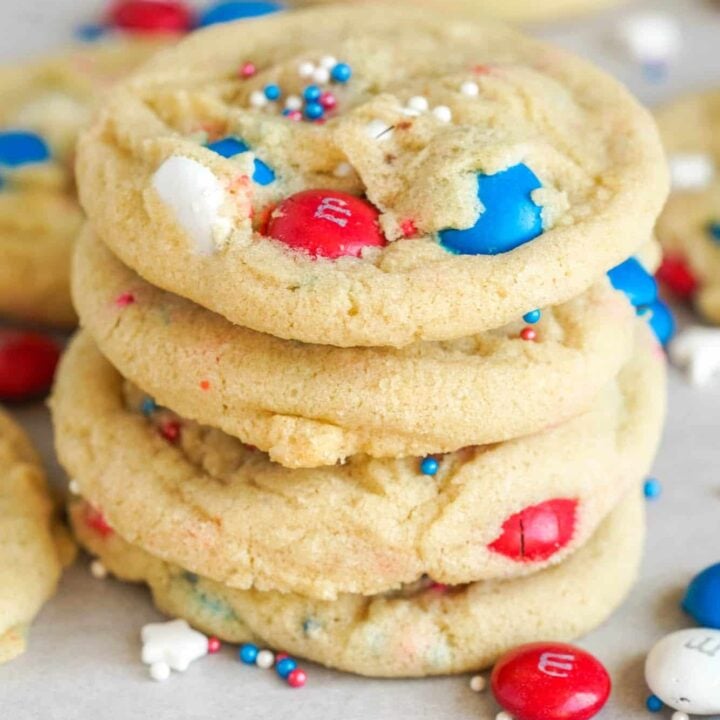 Chewy red, white, and blue M&M cookies are buttery, festive, and super easy to make—no chill time needed and ready in under 30 minutes. Easy cookie recipe and a fun, simple treat for your 4th of July or Memorial Day party.