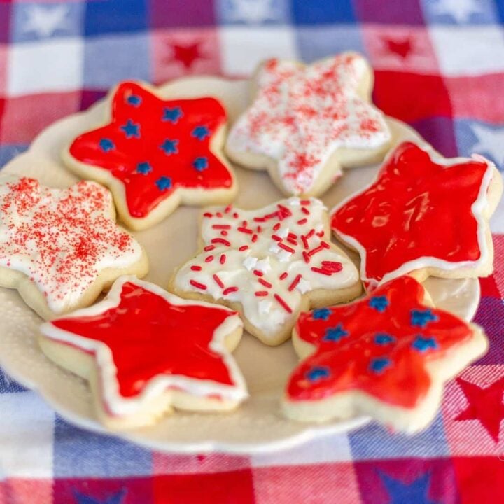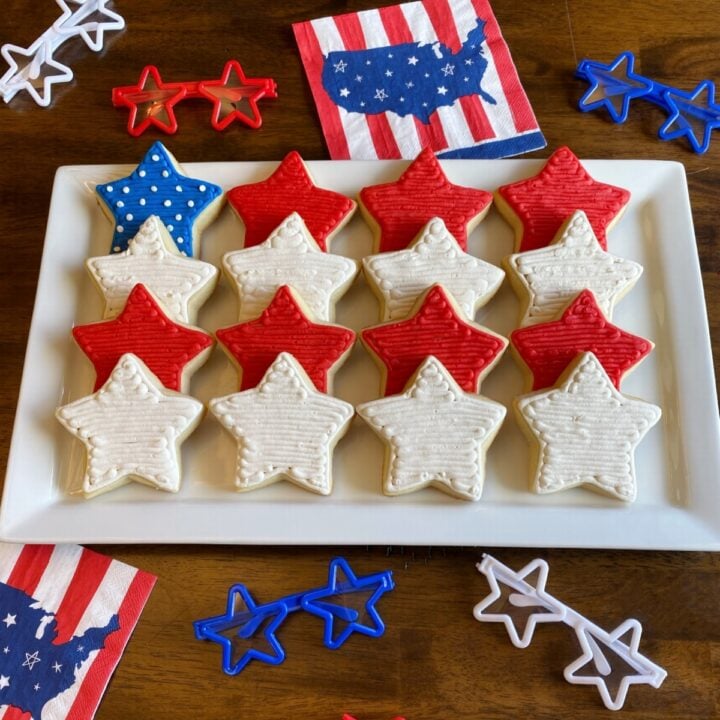 This red, white, and blue sugar cookie platter is arranged to look like the American flag, with soft sugar cookies cut with star cookie cutters and decorated with buttercream frosting. It’s an impressive, easy 4th of july dessert for Memorial Day, 4th of July, or any patriotic gathering.