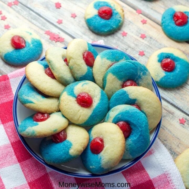 These red, white, and blue thumbprint cookies are filled with colorful jam and topped with festive sprinkles. They’re a fun and simple way to celebrate Independence Day with homemade cookies.