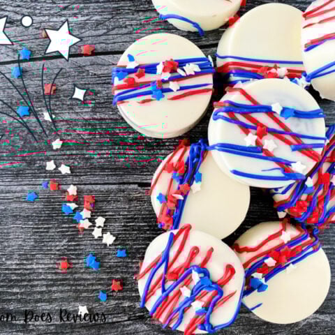 Chocolate-covered Oreos are dipped in white chocolate and decorated with red, white, and blue sprinkles. These delicious patriotic cookies are no-bake, easy to customize, and perfect for kids to help with.