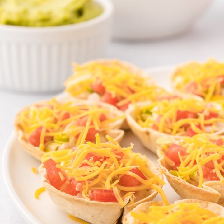 Taco Cups are bite-sized tacos made from baked tortilla shells filled with zesty cream cheese, lettuce, tomatoes, and shredded cheese. Festive appetizer for large gatherings.