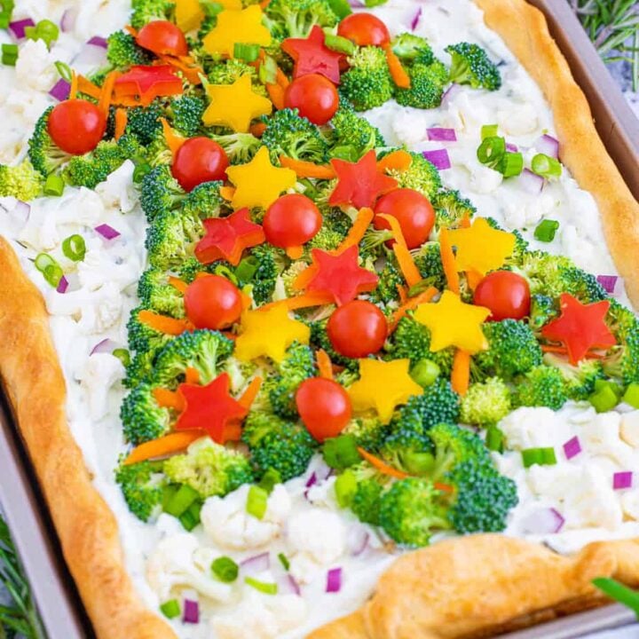 Christmas Veggie Pizza with crescent dough crust, savory cream cheese, and fresh vegetables arranged in the shape of a Christmas tree is a fun and easy party appetizer for the holiday season.