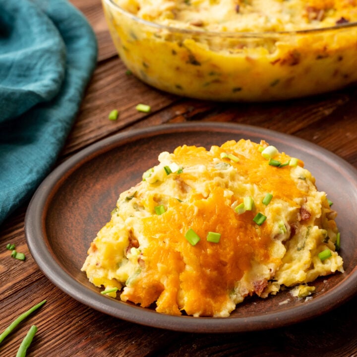 Loaded Mashed Potatoes with bacon, cheddar cheese, sour cream, and green onions is always a crowd-pleaser!