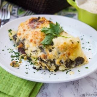 Cheesy Ravioli Lasagna is quick and easy to assemble with grocery store frozen lasagna, homemade Alfredo sauce, fresh spinach, and lots of gooey cheese.