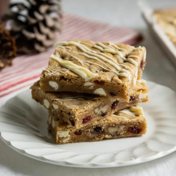 Nothing says happy holidays like these festive Cranberry White Chocolate Blondies. They're soft and chewy with tart cranberries and creamy white chocolate and easy to make.