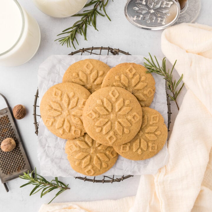Nutmeg Cookies are perfectly spiced cookies with a chewy texture and made with just six ingredients. Make them with cookie stamps or without, and add your favorite icing.