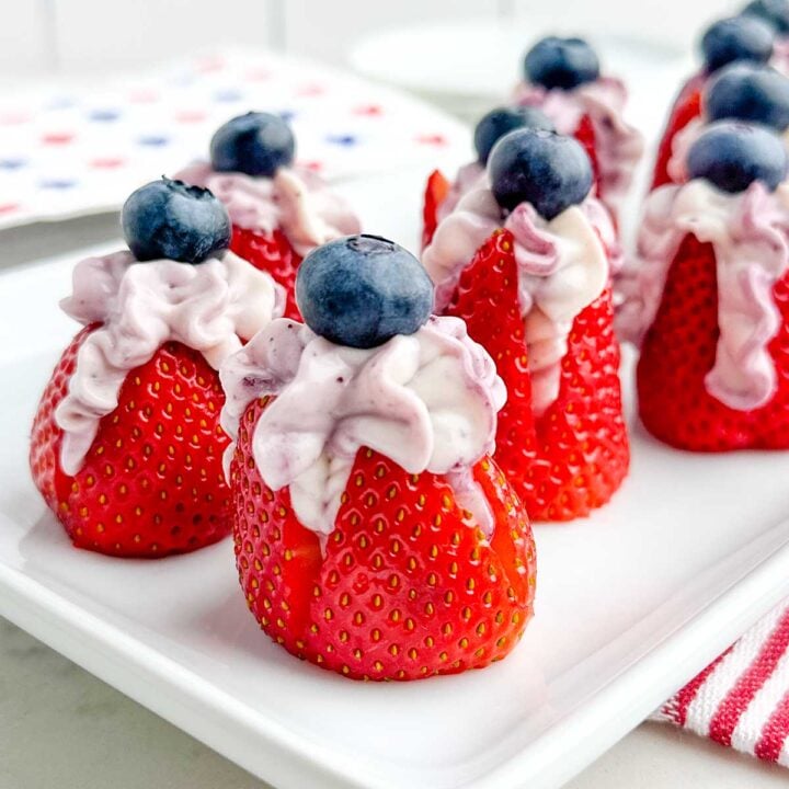 Cream Cheese Stuffed Strawberries are a delicious pre-party bite-sized snack with fresh strawberries, creamy cheesecake filling with white chocolate, and a blueberry swirl. Easy recipe and the perfect way to kick off your Labor Day meal.