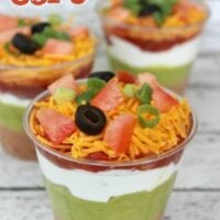 Seven Layer Dip Cups with delicious layers of seasoned beans, creamy guacamole, salsa, cheese, tomatoes, green onion, and black olives is an easy appetizer served in individual cups, making it perfect for parties.