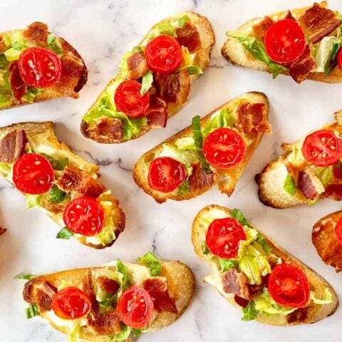 BLT Crostini appetizers are always fun to make and popular to serve. With crunchy romaine lettuce, juicy cherry tomatoes, creamy mayo, golden brown crostini, and plenty of crispy, savory bacon, they taste just like a mini BLT sandwich!