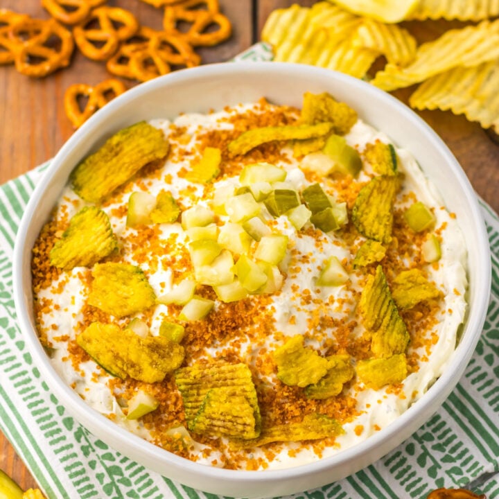 If you love fried pickles, you’ll definitely want to try this tasty dip recipe. Made with cream cheese, dill pickles, and spices, Fried Pickle Dip is the perfect game day dip or appetizer for your Labor Day gathering. Creamy, tangy, and crunchy, it’s a crowd favorite!