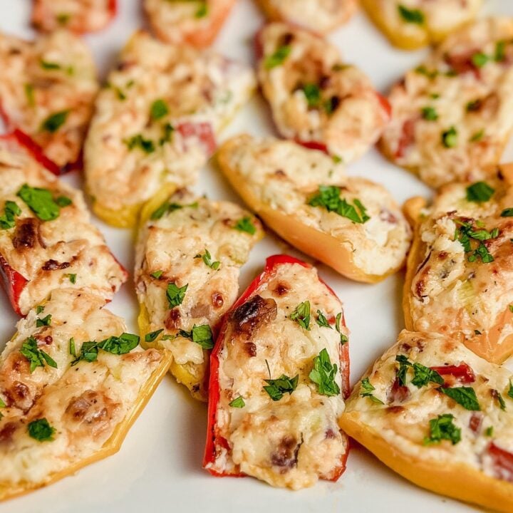 Stuffed Mini Peppers are a delicious and easy-to-make appetizer or side dish! Made with small bell peppers filled with cream cheese, cheddar cheese, green onions, tomatoes, bacon bits, and seasonings, bake or grill, and serve warm immediately or at room temperature.