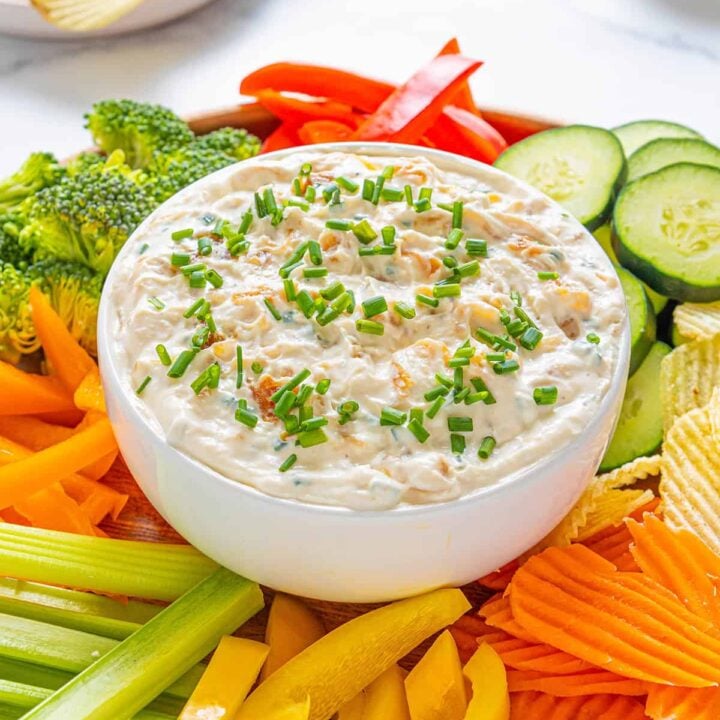 Greek Yogurt Onion Dip with caramelized onions is a super easy make-ahead dip perfect for potato chips and fresh veggies. Made with three layers of sweet and savory onion flavor, it is sure to be a hit with all of your family and friends.