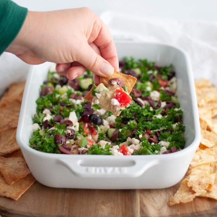 Layered Greek dip is a light and fresh party dip packed with flavors of the Mediterranean. Made with delicious layers of hummus, fresh tomatoes, crunchy cucumber pieces, creamy feta cheese, kalamata olives, and fresh herbs, this easy to assemble dip is the perfect appetizer for your next party!