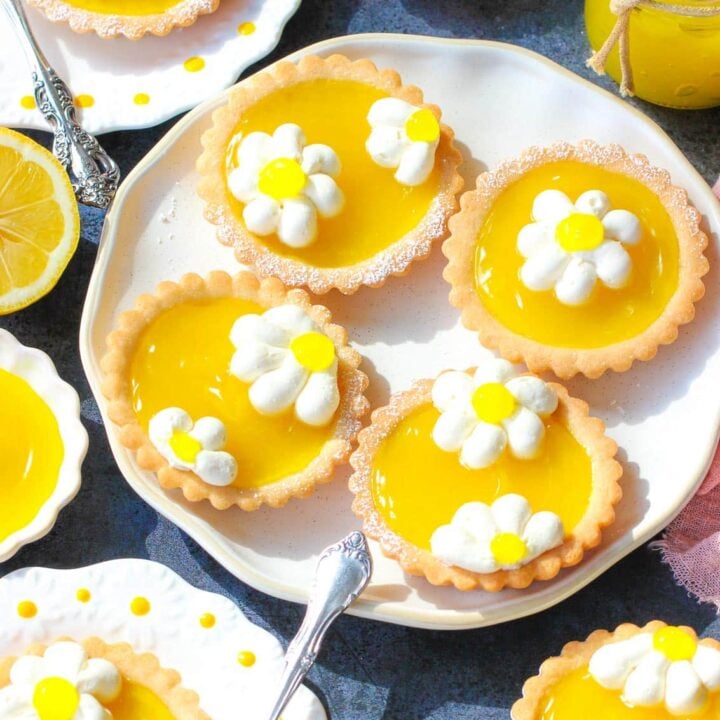 Lemon Tartlets with buttery pastry, sweet, tangy lemon curd, and adorable whipped cream flowers are an easy, impressive spring and summer dessert.
