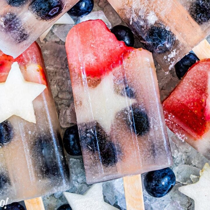 Homemade Fruit Popsicles are made with fruit juice and packed with real, fresh fruit, so they’re as beautiful as they are tasty. Easy, and refreshing, these red, white, and blue popsicles are the perfect way to beat the summer heat.