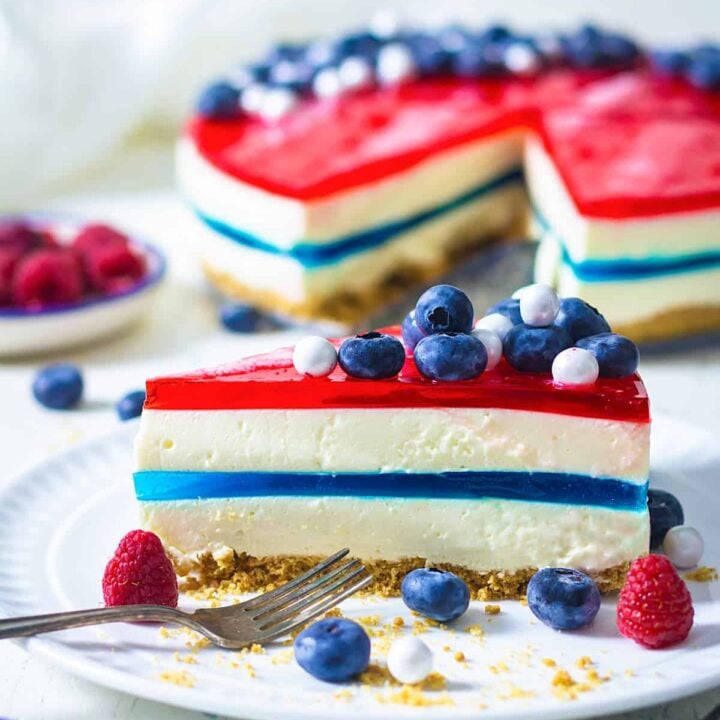 This no-bake red, white, and blue cheesecake is a refreshing and patriotic dessert with a creamy filling and festive layers. An easy recipe with simple ingredients, perfect for any summer gathering.