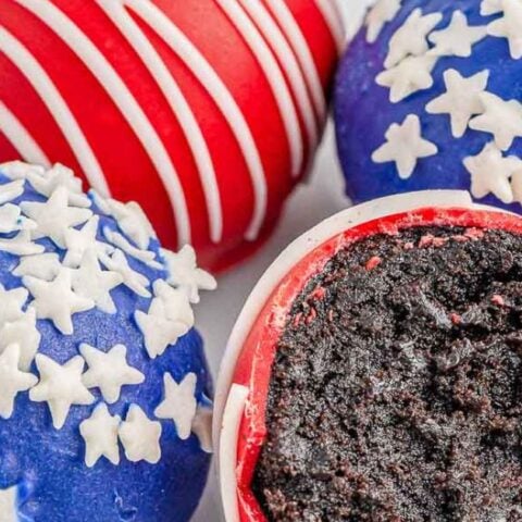 4th of July cake balls are delicious, bite-sized truffles with moist red, white, and blue cake crumbs and cream cheese and coated in brightly colored candy melts. A crowd-pleasing, festive dessert for patriotic holidays.