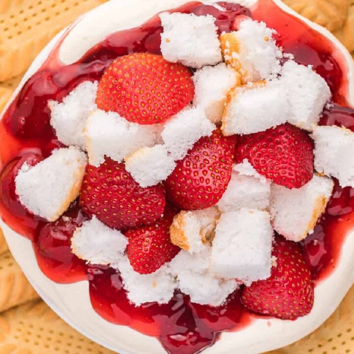 This creamy cheesecake dip tastes just like strawberry shortcake! Fluffy cream cheese filling is topped with sweet strawberry pie filling, pieces of angel food cake and fresh strawberries, for an easy no-bake summer dessert.