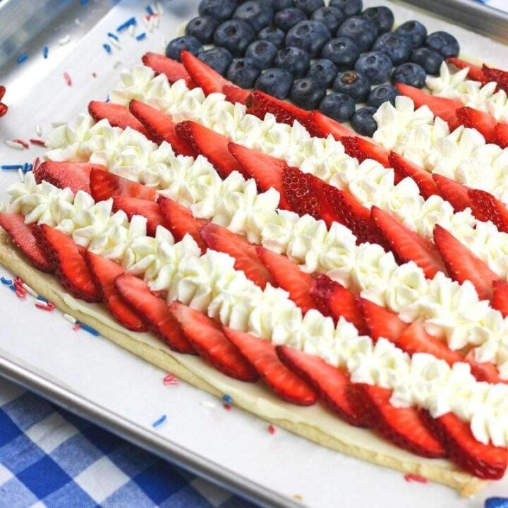 This Flag Fruit Cookie Pizza is a fun and festive red, white, and blue dessert made with a soft sugar cookie crust, a layer of sweet cream cheese frosting, and plenty of fresh strawberries and blueberries. It’s an easy and eye-catching treat for the 4th of July, Memorial Day, Labor Day—or any summer celebration!