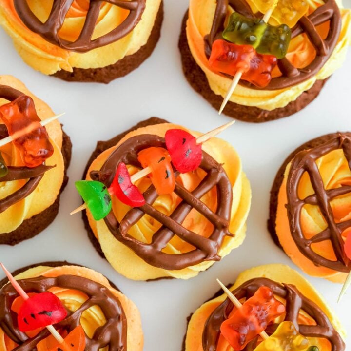 Soft chocolate sugar cookies topped with fiery frosting, chocolate grill grates, and tiny gummy candy kabobs, these fun summer sugar cookies are perfect for Father's Day or a backyard BBQ.