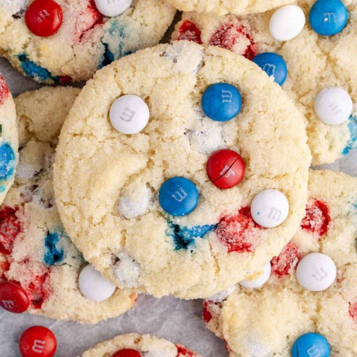 Soft, chewy vanilla sugar cookies with red, white, and blue M&Ms are the perfect, simple patriotic cookie for summer holidays like the 4th of July, Memorial Day, and Labor Day. Fun, quick recipe, easy to prep, and kid-friendly!