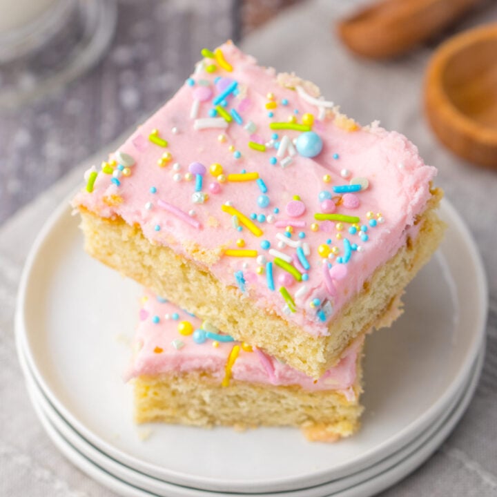 Easy, delicious frosted sugar cookie bars are soft with a chewy texture and frosted with pillowy soft homemade frosting. All the flavor of frosted sugar cookies without having to roll or chill the dough!
