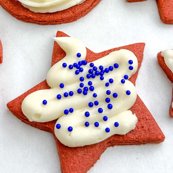 Red Velvet Cut-Out Cookies are soft and chewy and keep their shape perfectly—no chilling, no spreading. Cut them into shapes like strawberries, cherries, or trendy lobsters for a fun summer treat. Top them with cream cheese frosting and decorate with sprinkles and colorful sanding sugar for the perfect summer treat.